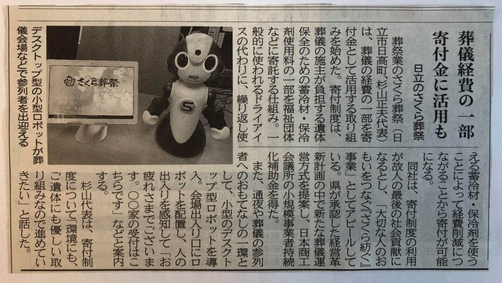 さくら葬祭の取り組みが茨城新聞に掲載されました 2020/02/22 さくら紡ぐ(つむぐ)事業と、小型ロボットと人を繋ぐ(つなぐ)活動を茨城新聞社に取り上げていただきました。 これからも AI愛する人を SOU想う心と SOU送るまごころ の お別れに寄り添っていきたいと思います。